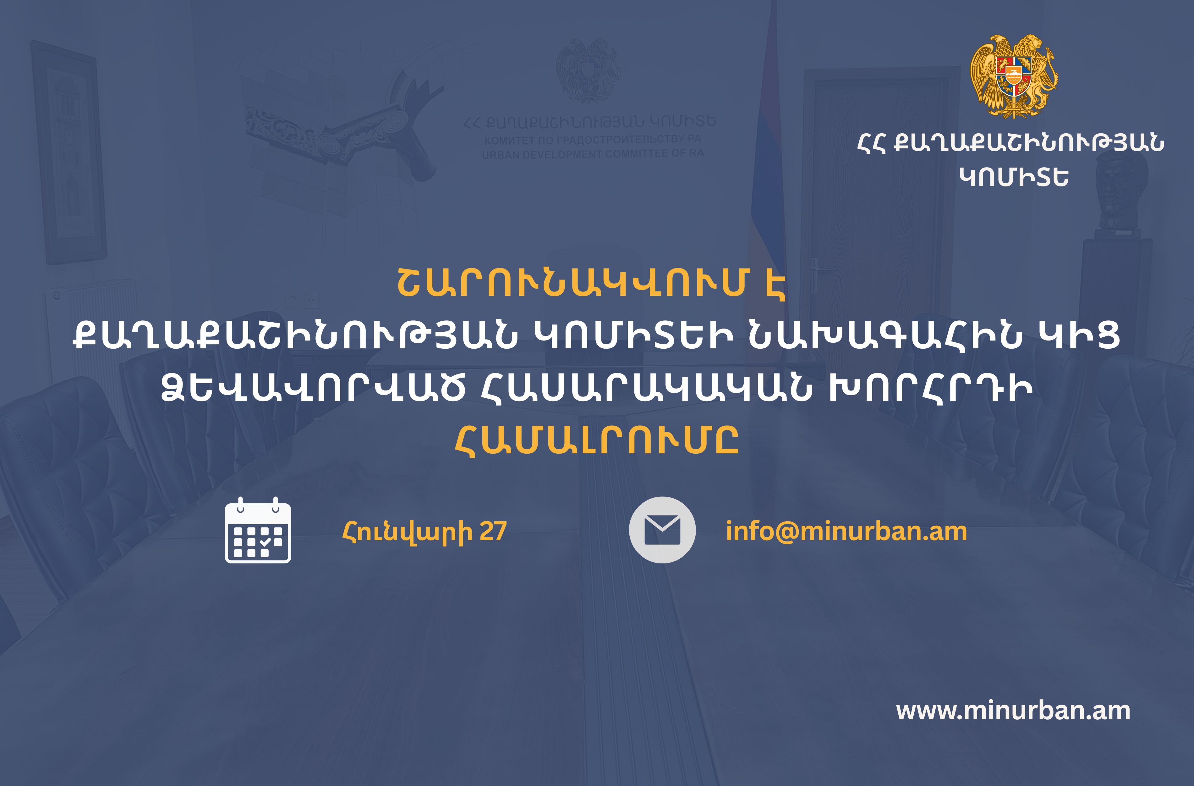 Ձևավորվել է քաղաքաշինության կոմիտեի նախագահին կից հասարակական խորհուրդ, որի կազմը հաստատվել է Քաղաքաշինության կոմիտեի նախագահի 2025 թվականի դեկտեմբերի 18-ի 224-Ա հրամանով։ Խորհրդի կազմը համալրելու նպատակով Քաղաքաշինության կոմիտեն շարունակելու է ընդունել նոր հայտեր։