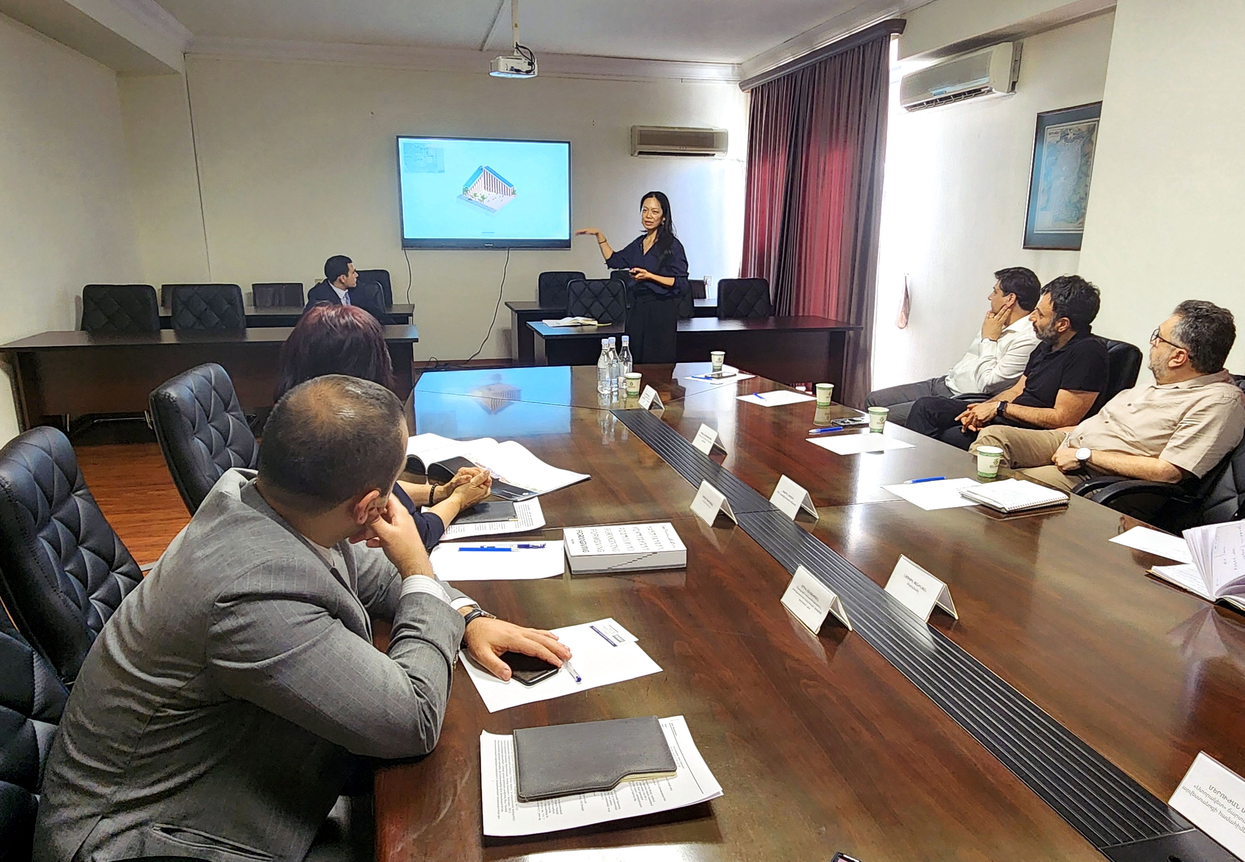 Հանդիպման ընթացքում ներկայացվել է էսքիզային նախագիծը, քննարկվել են հայեցակարգի հիմքում դրված առանցքային սկզբունքները, տեղական առանձնահատկությունների և կանաչ տարածքների ինտեգրմամբ առաջարկվող ճարտարապետական լուծումները։